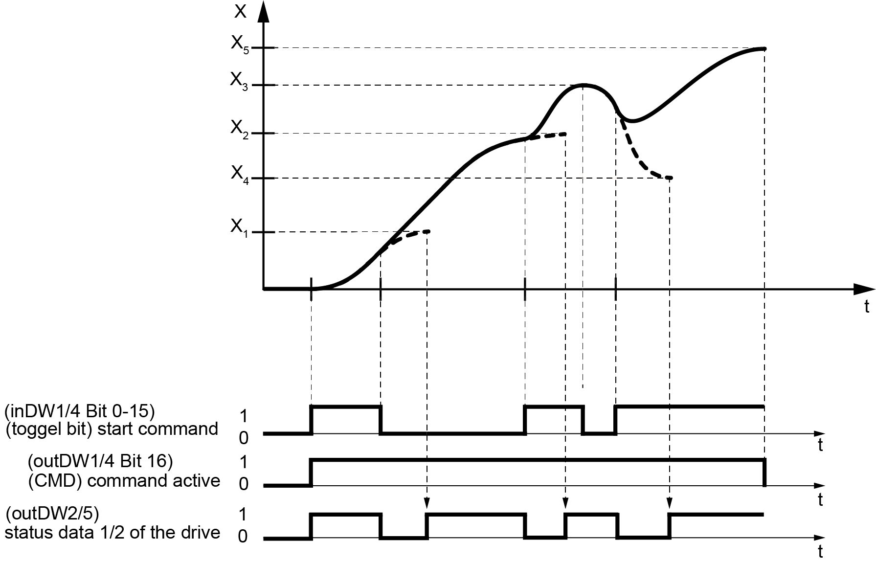 The command positioning absolute or relative can be retriggered before the positioning process is completed. During retriggering, the position and speed setpoint can be changed. When positioning absolute, the previous position setpoint is replaced, while positioning relative, the new position setpoint is added to the previous one. Modified speed setpoints have an immediate effect on the movement that is still in progress. Retriggering is possible if the current positioning in status data outDW2 or outDW5 returns the value 1. If the status data outDW2 or outDW5 returns the value 0 it can not be retriggered yet. For retriggering the command must be restarted.
